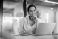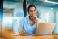 • Smiling woman in office using laptop while holding glasses and working thoughtfully