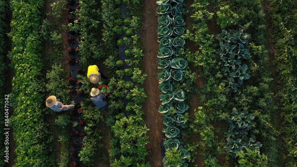 Naklejki Folklor - Workers pick fresh vegetables in rows of crops on a summer morning while the sun shines overhead... #1840471042