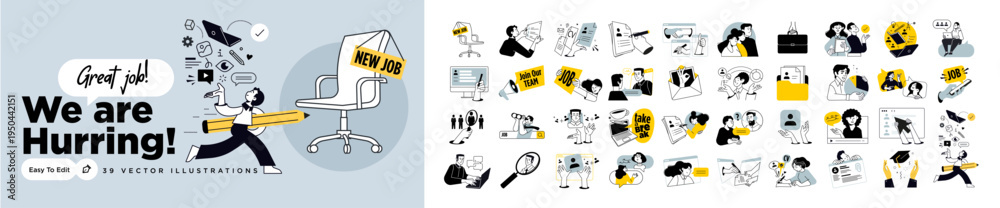 • Business vector illustrations of human resources, career, job search, employment, CV and business skills. Concepts for graphic and web design, social media, business and marketing material.