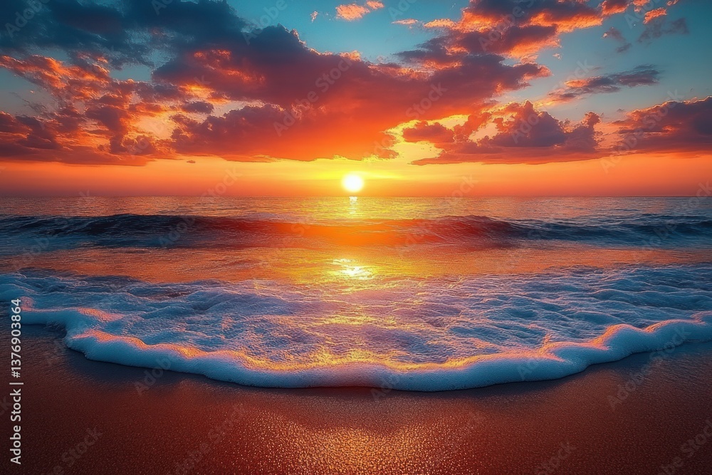 • Stunning Sunset Over the Ocean with Vibrant Hues and Gentle Waves