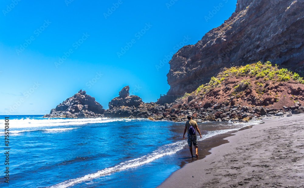 • A young tourist enjoying summer by the sea on some rocks in Playa de Nogales in the east of the Island of La Plama, Canary Islands. Spain
