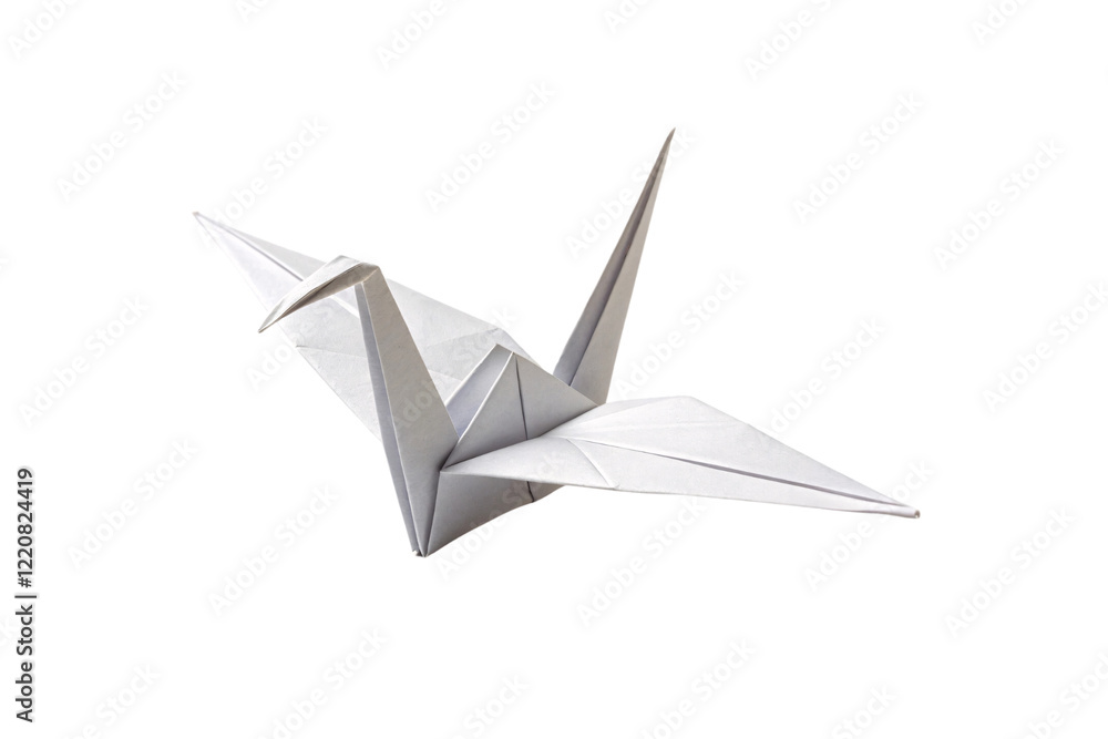 • A graceful origami crane with slightly spread wings, highlighting its delicate craftsmanship and elegant simplicity. Isolated on a transparent background