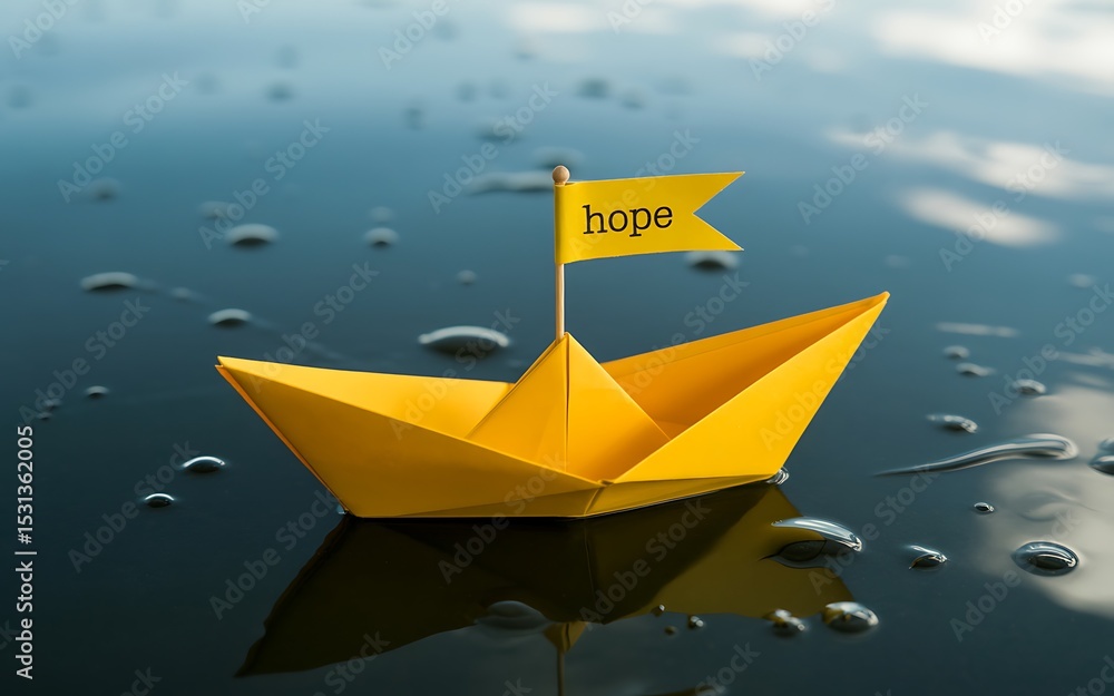 • A vibrant yellow origami paper boat floats serenely on dark blue water its tiny mast proudly displaying a small yellow flag inscribed with the word hope the surface of the water is subtly