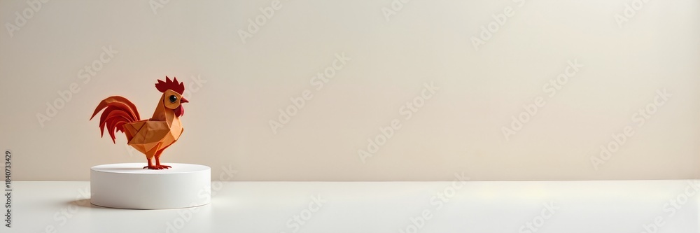 • Whimsical origami rooster figurine showcasing playful elegance on a minimalist pedestal against a soft pastel backdrop, corporate-friendly concept of branding and advertising.
