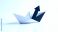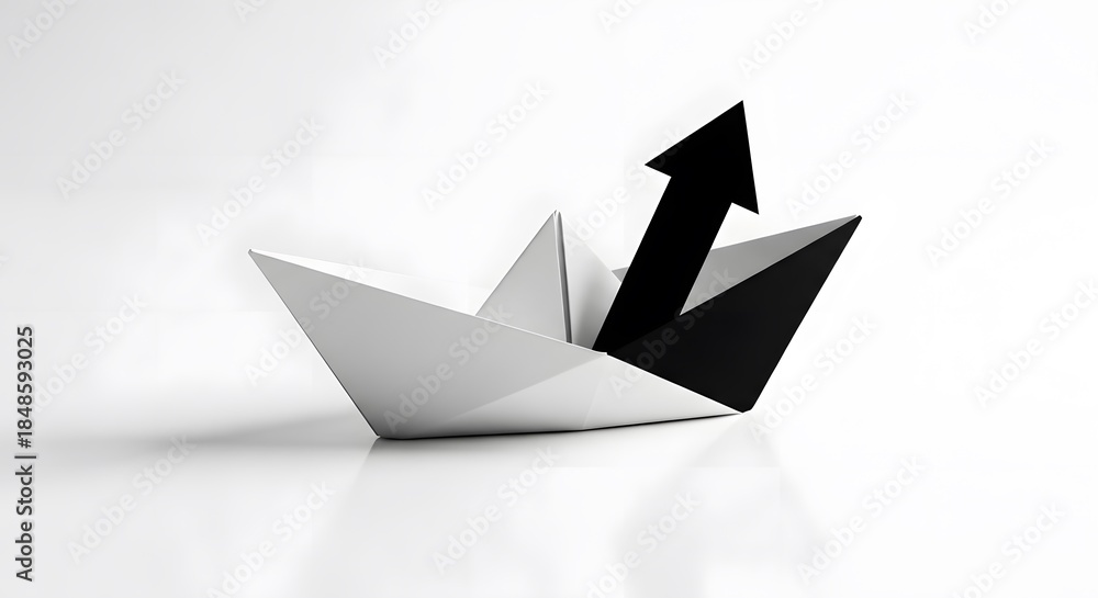 • paper boat sailing forward with black arrow showing direction and growth on white background representing business success and leadership