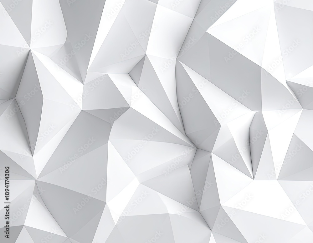 • Abstract white low poly geometric background texture with sharp facets and subtle shading.