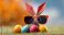 • Colorful origami rabbit wearing orange sunglasses stands among decorated Easter eggs on a grassy surface with a blurred background of autumn foliage