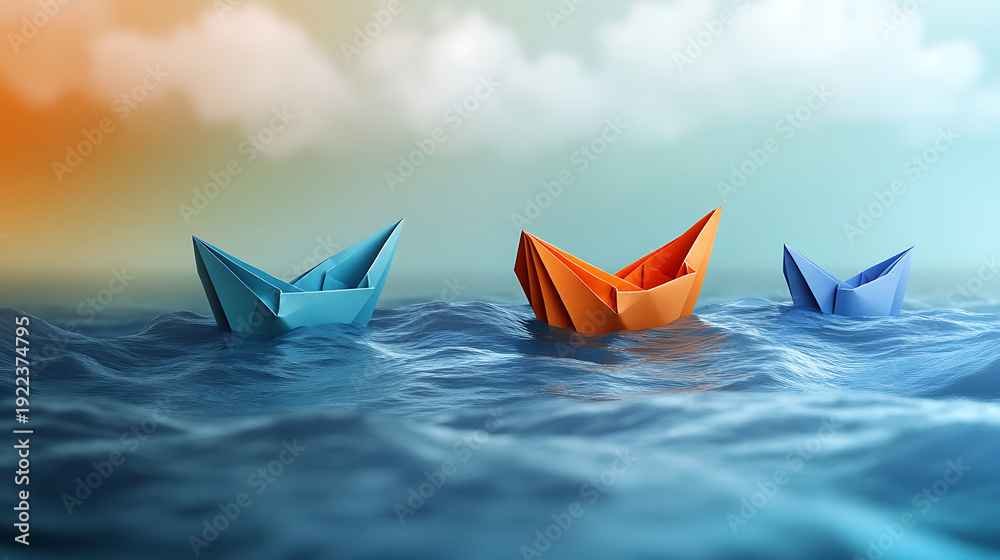 • Three origami paper boats sailing on stylized ocean waves under cloudy sky concept.