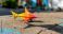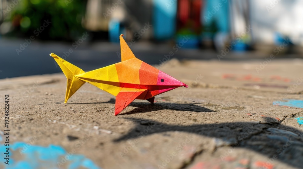 • Colorful origami shark figure showcasing vibrant yellow, orange, and red hues against a blurred outdoor background with artistic graffiti elements