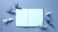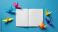 • An open blank book surrounded by colorful origami cranes on a blue background