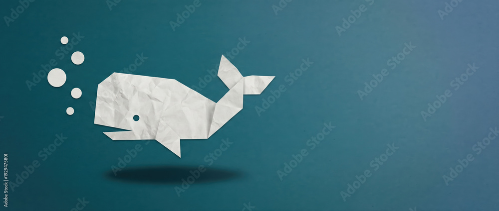 • Minimalist paper origami whale swimming in a deep blue sea concept for creativity and conservation.