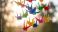 • Colorful origami cranes hanging against blurred background for decoration