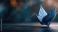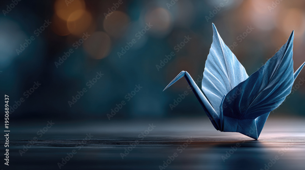 • Blue leaf folded into an origami crane symbolizing peace, hope and remembrance, resting on a reflective dark surface with soft bokeh for a contemplative mood
