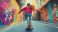 • Young woman skateboarding on vibrant graffiti street, motion blur capturing dynamic movement. Long-haired skater in red sweater and jeans against colorful urban art background