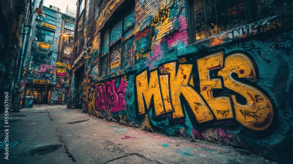 • A graffiti covered alleyway with the word Mike written on it. The alleyway is filled with colorful graffiti and has a vibrant, urban feel to it
