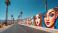 • Vibrant desert mural art features colorful faces of women lined up on a wall. Palm trees and mountains form the backdrop of this urban street scene. Modern, contemporary graffiti artwork.