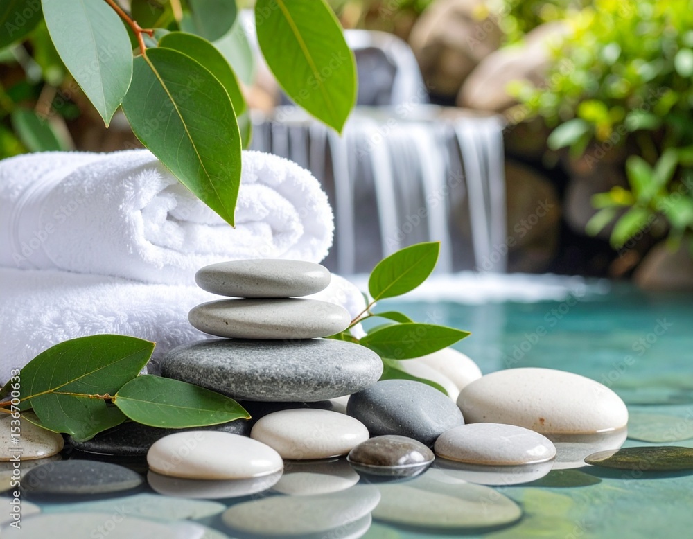• Tło spa, wellness z ręcznikami, kamieniami, wodą, liśćmi i wodospadem