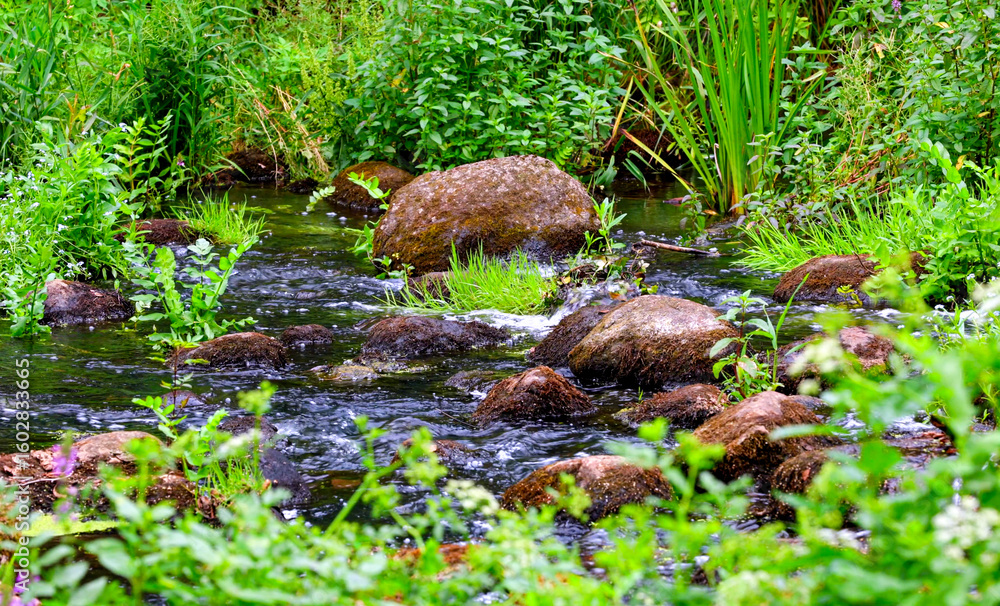 Naklejki Kamień - widok płynącego potoku wraz z kamieniami i roślinnością #1602833665