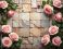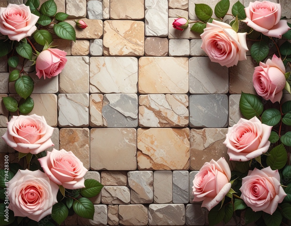 Naklejki Kamień - Różowe róże tworzące obramowanie na ścianie z prostokątnych, regularnych kamieni #1719428300