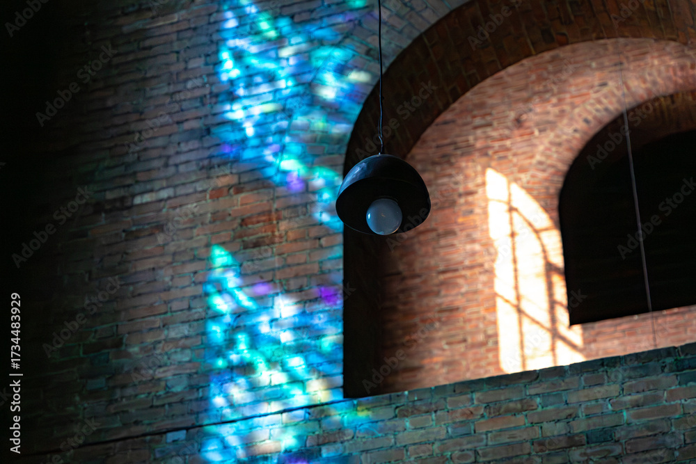 Naklejki Kamień - Światło z witraża padające na ścianę modernistycznego kościoła #1734483929