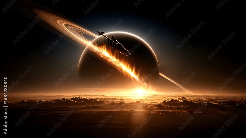 • Kosmische Szene mit Raumsonde vor Saturn und Ringen