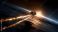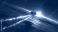 • Futuristische Raumsonde im Orbit mit glühenden Antrieben