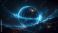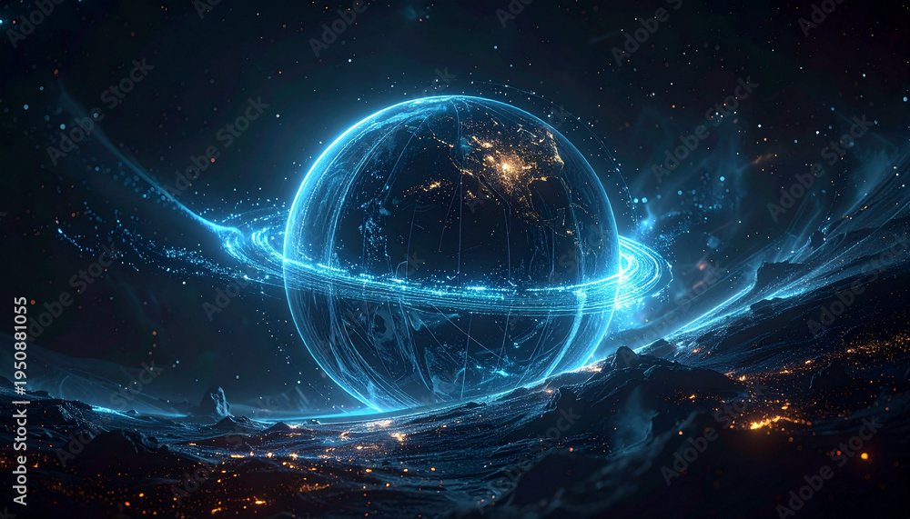 • Abstract digital rendering of a blue sphere with data streams and swirling energy