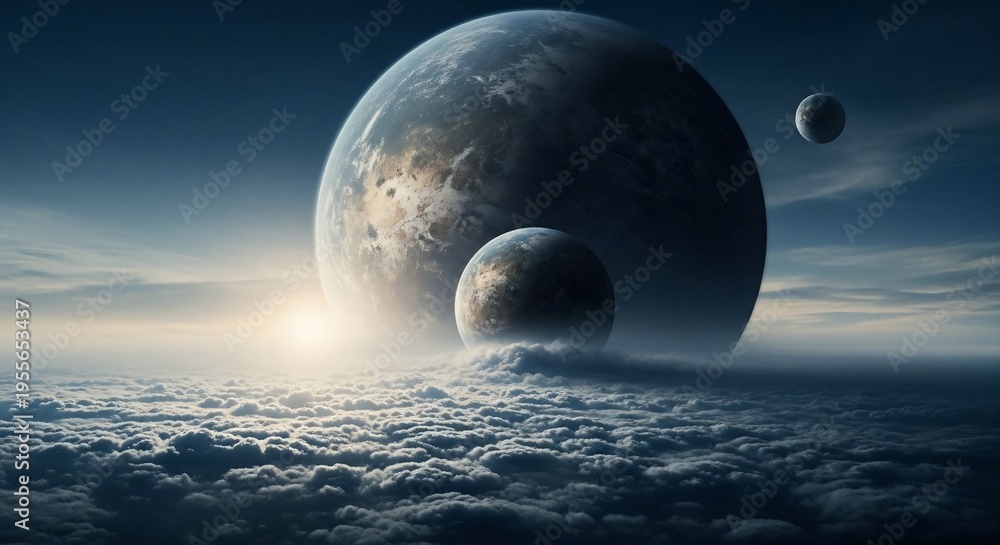 • Planets above the clouds with bright sunlight concept image digital artwork