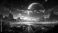 • Fantasy landscape with giant planets mountains and a long road at twilight