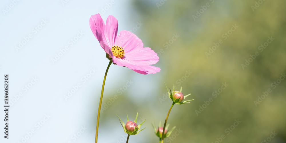 Naklejki Kosmos - Beautiful pink cosmos flowers blooming in garden in panorama Bokeh background. Long cover or... #396052205
