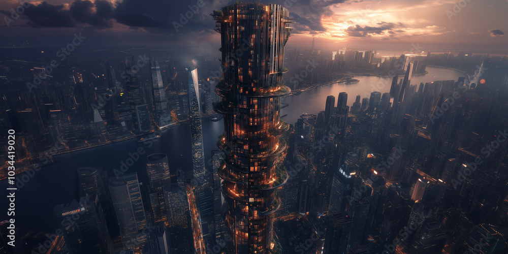Naklejki Panorama - Ciekawe projekty drapaczy chmur - 0185 - Zbliżenie ciemnego wieżowca na tle miasta #1034419020