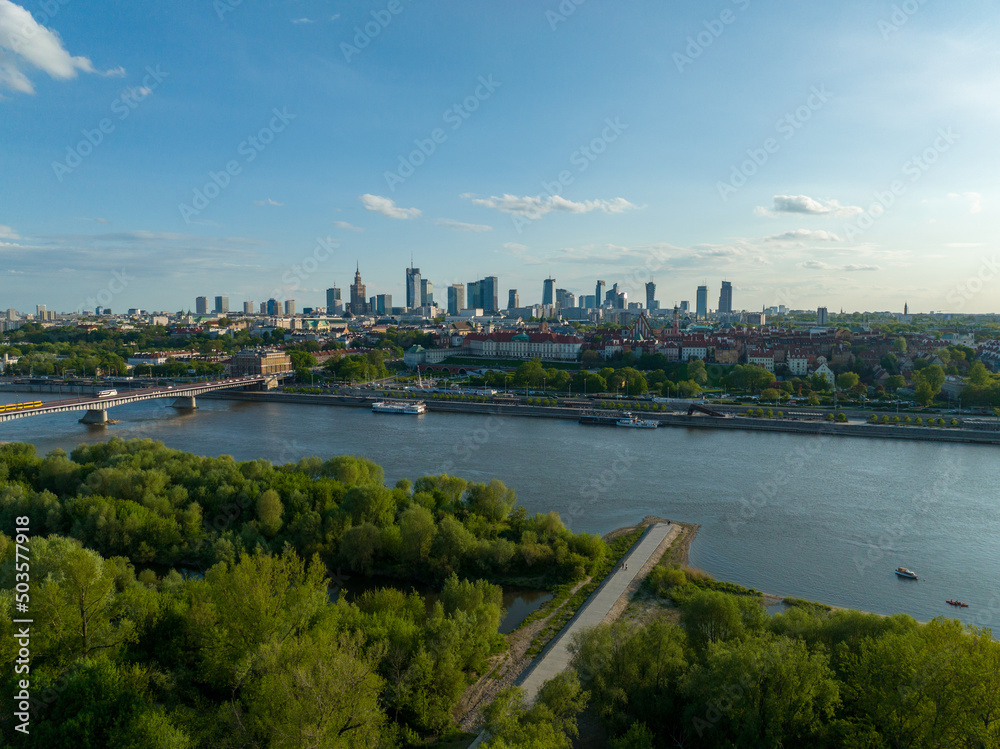 Naklejki Panorama - widok z lotu ptaka na centrum Warszawy, panorama miasta, wieżowce i rzekę Wisła, wiosna, zielone... #503577918