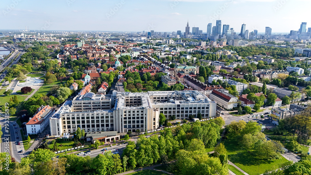 • Warszawa, panorama miasta, niebieskie niebo i delikatne chmury