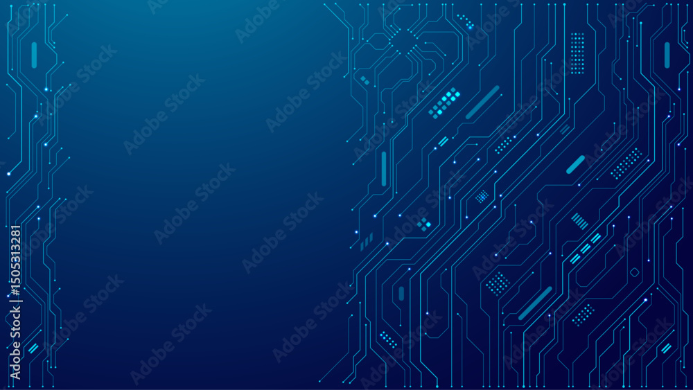 • Abstract technology blue circuit board texture or pattern. Web background design with text. Futuristic blue circuit board on tech bg. AI innovation concept. Light blue connected dots and lines. Vector