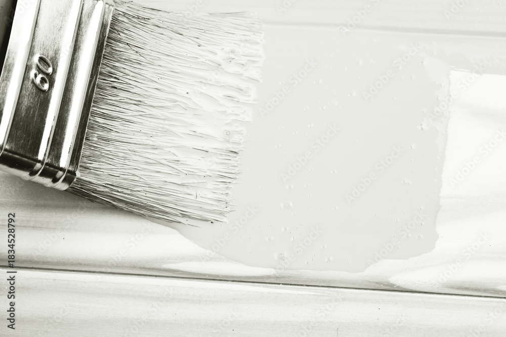 Przestrzeń - Paintbrush spreading white paint on a light wooden surface during home renovation work, showing... #1834528792