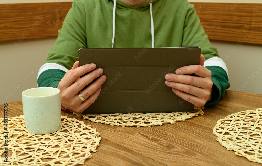 Kawa - Mlody mężczyzna korzystający z tableta w restauracji oczekuje na spotkanie, #1451797595