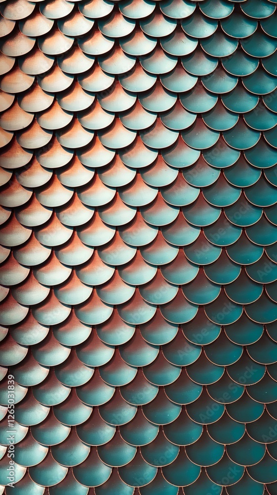 • Colorful fish scale pattern with teal and copper hues, showcasing intricate texture and design.
