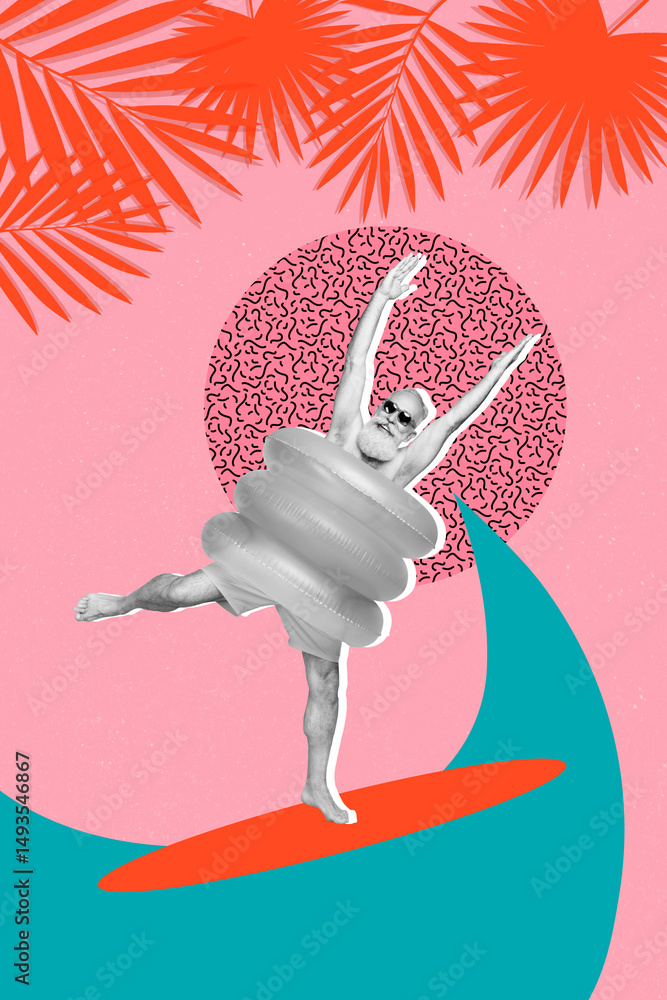 Ludzie - Sketch vertical photo collage of happy old man surfer wear inflatable lifebuoy stand surfboard... #1493546867