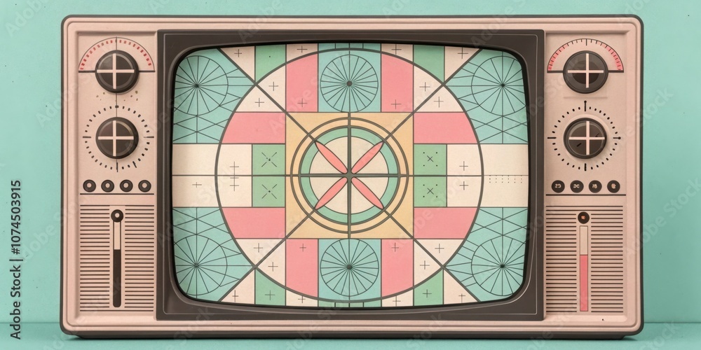 • Test Pattern A vintage analog screen displays an intricate test pattern characterized by bold geometric shapes and soft pastel colors creating a sense of nostalgia for old media