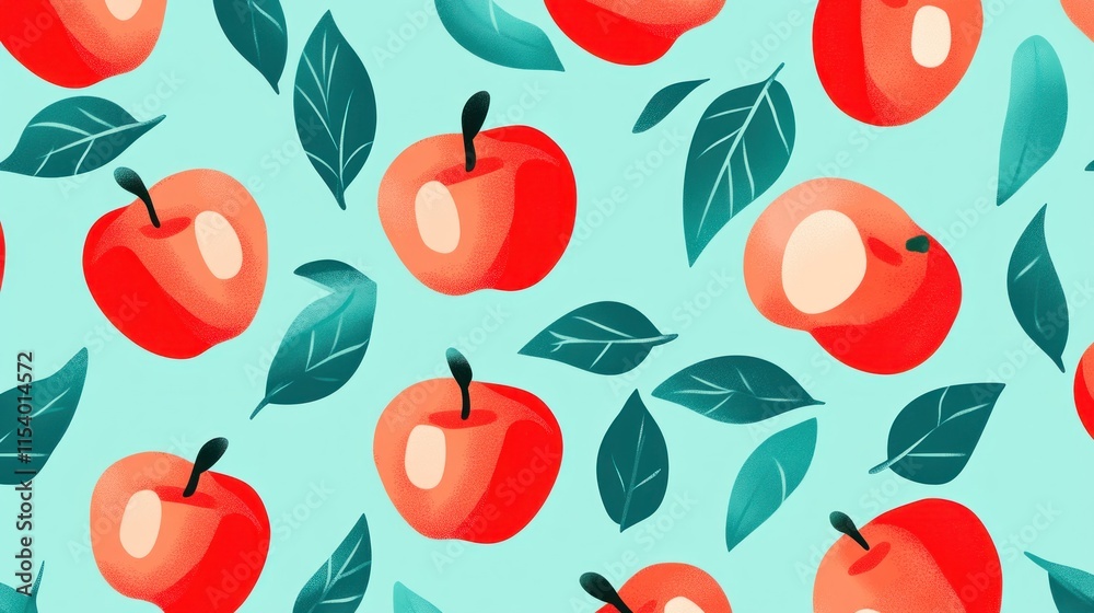 Turkus - Seamless pattern of red apples and teal leaves. #1154014572