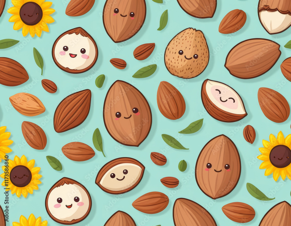 Turkus - Cute drawn nuts and seeds pattern with smiling faces on a blue background #1173586860