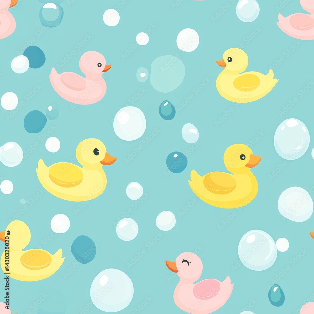 • Playful repeating pattern design, floating soap bubbles, cute bath time ducks, soft pastel color palette, transparent water droplets, continuous geometric layout, clean vector illustration style,