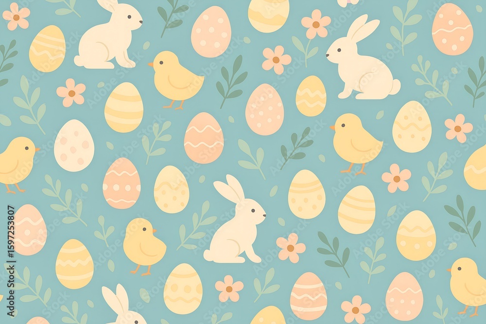 • Pastel Easter Pattern with Bunnies, Chicks, and Decorated Eggs for a Festive Spring Holiday Celebration