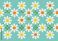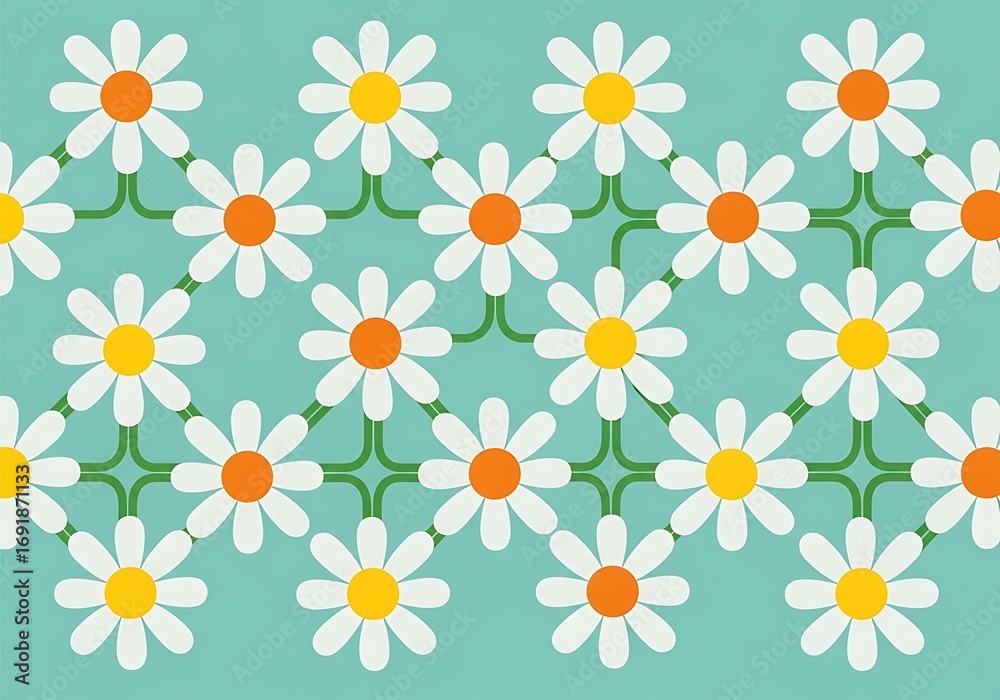 • Floral pattern with daisy flowers arranged in a diamond grid on light cyan background creating a cheerful and vibrant
