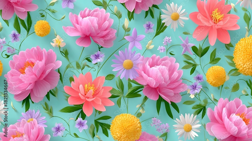 • This detailed seamless floral pattern presents a vibrant arrangement of pink peonies coral blossoms white daisies and tiny purple flowers with green foliage on a bright turquoise background