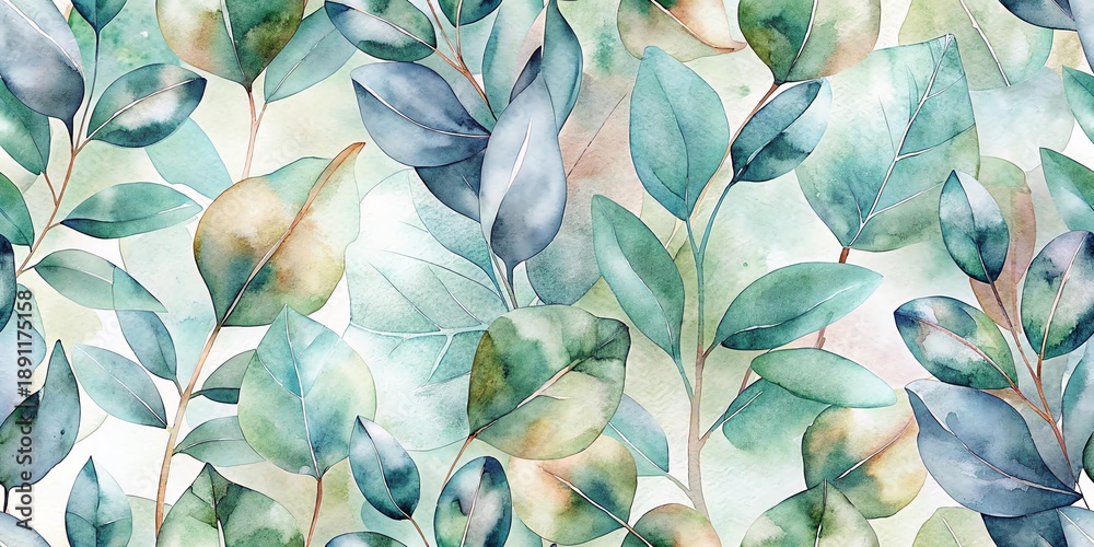 • Seamless watercolor pattern of eucalyptus leaves in shades of blue, green, and brown