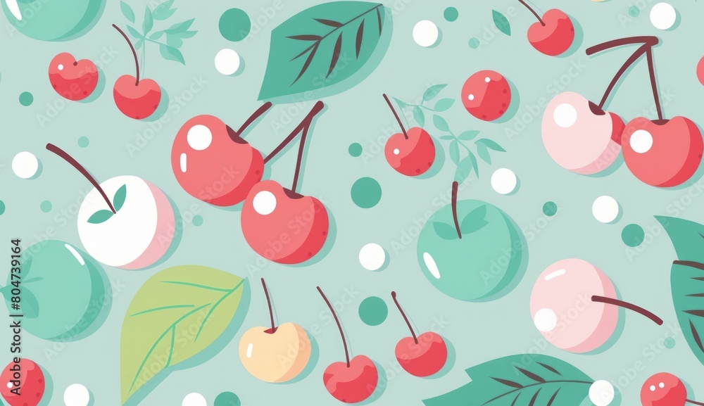 • Colorful cherry pattern on a mint background, pastel shades, themes focusing on freshness and organics. Flat graphics