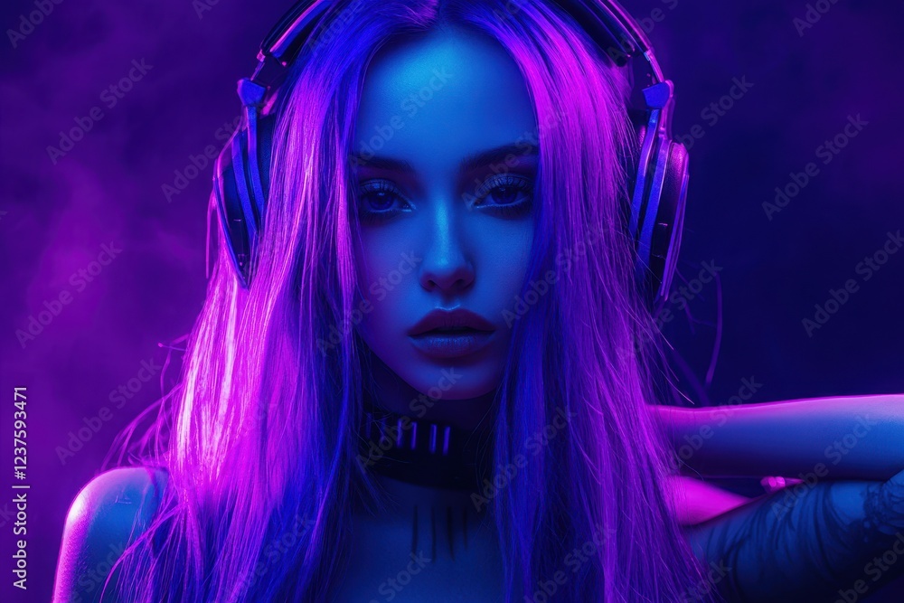 • Stunning girl with violet hair in a futuristic outfit against a dark backdrop Neon purple glow Young woman wearing modern headphones enjoying music