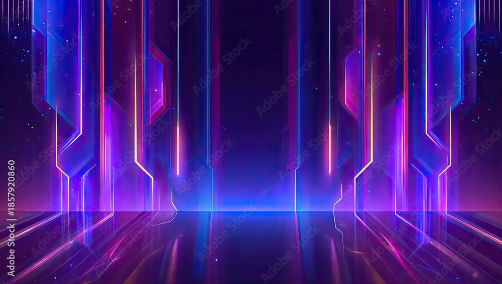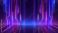 • Abstract neon corridor reflects, violet, blue, & pink light beams downward