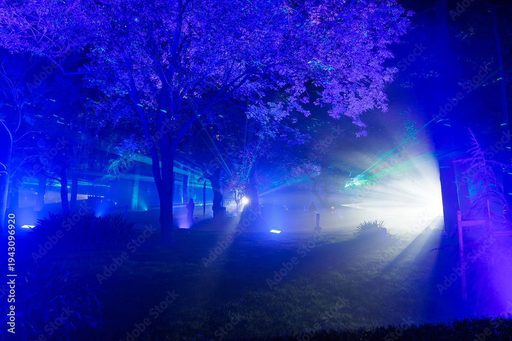 Chabrowy - Seville, Spain public gardens at night show blue and violet beams slicing mist, trees lit from... #1943096920
